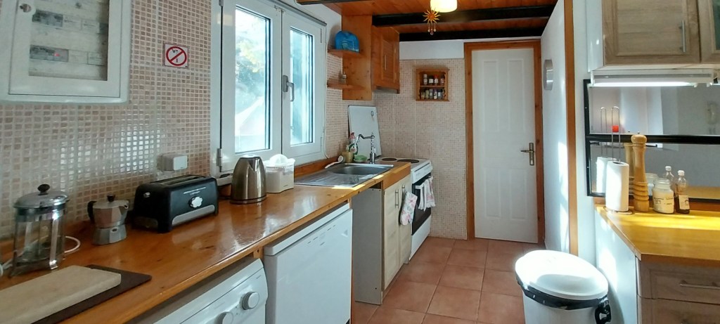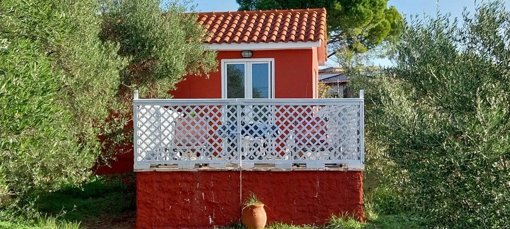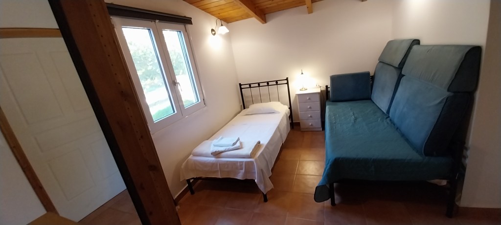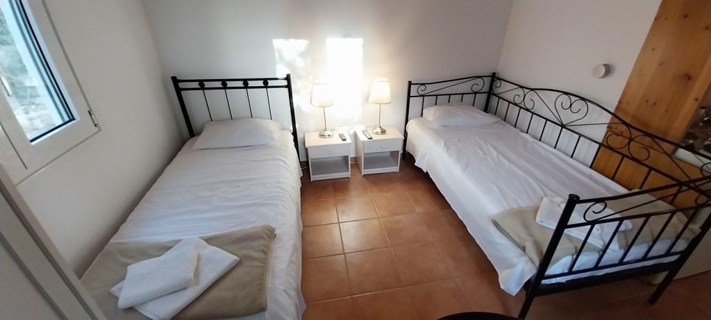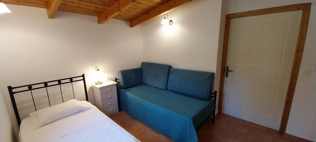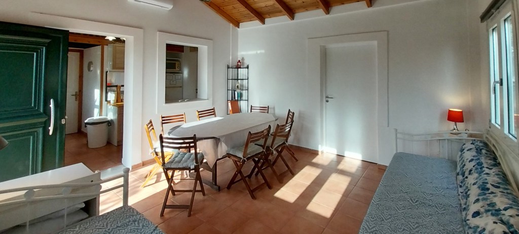 The Dorothea house sleeps 2 on an 160cm wide double bed with access to a disabled bathroom with shower, sleeps 2 on 2 single beds with access to the same disabled bathroom, sleeps 2 on a 140cm double bed with ensuite bathroom with shower and sleeps 2 on 2 single sofas in the living room. It has a full kitchen, including a dishwasher and a washing machine. In the living room there is a table and 8 chairs. It has a very low-ceiling attic to store luggage. It has its own patio under vine and olive tree pergola with sea view and 1 double hammock, 2 tables, 8 chairs and 4 sun loungers.