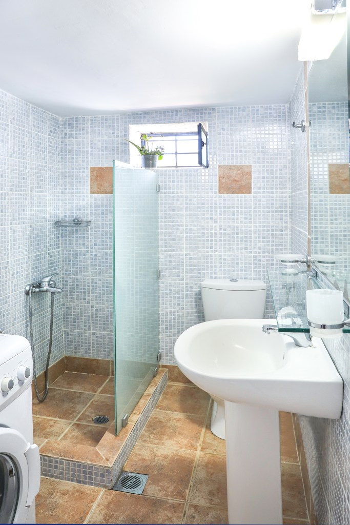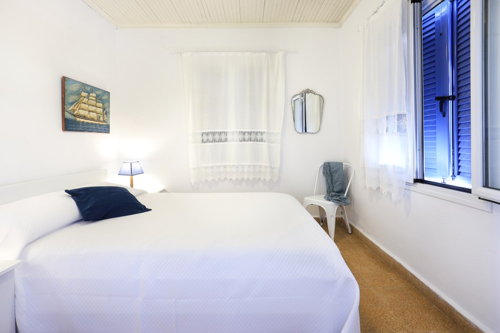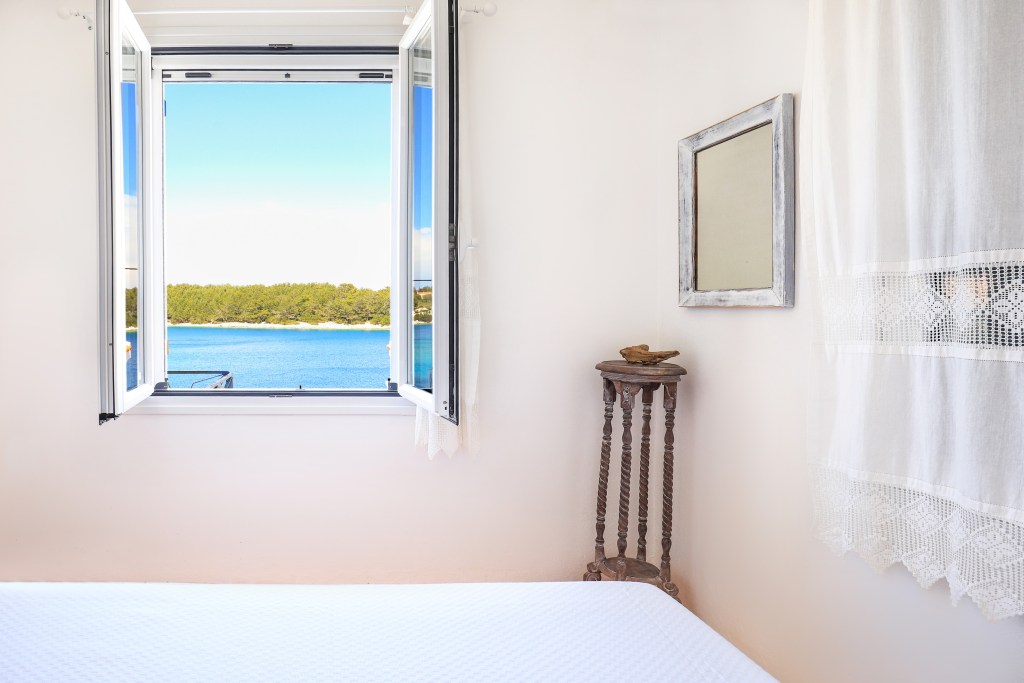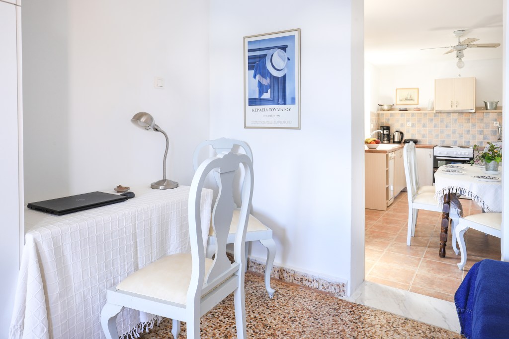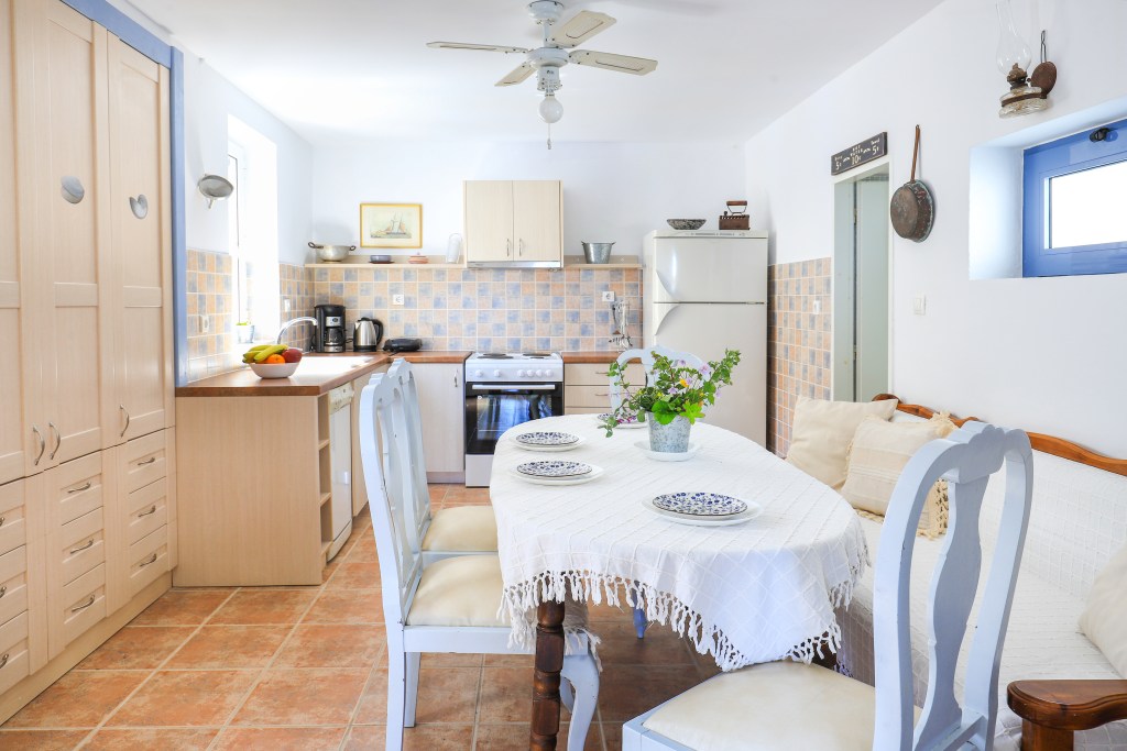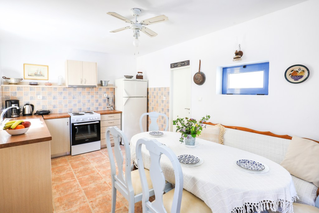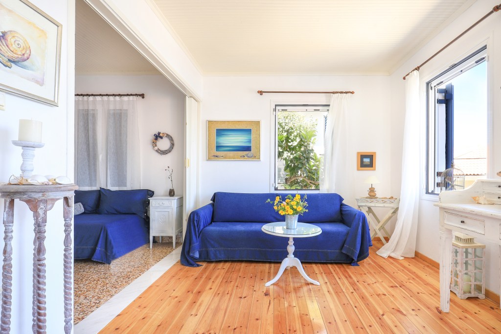 A very comfortable living space with sofa and balcony connected to the terrace (15sqm) where you can enjoy the stunning views of the sea, the sunrise, the old Venetian lighthouse and the island of Ithaka. There are two bright and airy bedrooms, each with a double bed and a wardrobe. One of the bedrooms has a view to the sea and the other view to the back garden. There is a fully equipped kitchen/dining room with a table and chairs with door leading to the backyard (25sqm). Between the living room and the dining room is an area with a desk and a sofa-bed, which can be separated with sliding doors. Off the kitchen is the family bathroom with W.C and a shower. Air conditioning is throughout the house with additional ceiling fans.
